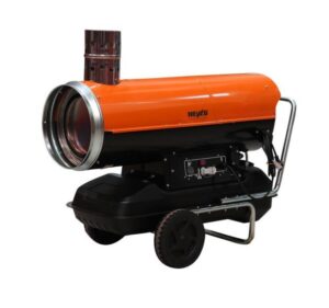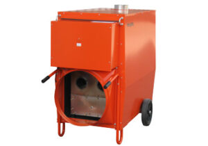 - Heißluftturbine mit Rauchabführung – Öl-betrieben, 34 kW, für große Hallen, Zelte und offene Baustellen.